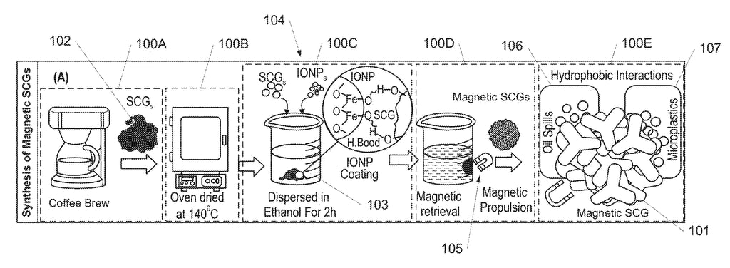 George Mason University’s patent application (US20250017234A1) introduces a novel method for creating magnetic microbots from spent coffee grounds (SCGs). These microbots are designed to remove pollutants such as oil, microplastics, and industrial dyes from water. The key innovation lies in the use of iron oxide nanoparticles (IONPs) to magnetize the coffee grounds, enabling precise control and retrieval of the microbots using an external magnetic field.