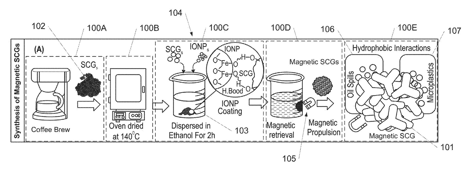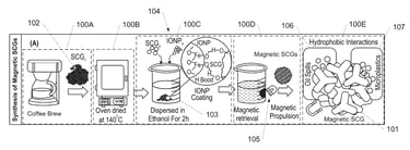 1. Magnetization: Spent coffee grounds are dried and mixed with iron oxide nanoparticles in an ethanol solution. The IONPs bond to the coffee grounds through hydrogen bonding, imparting magnetic properties.